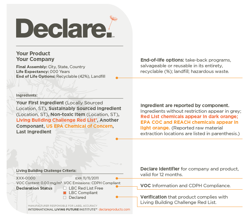 Certifies that a product is completely free of the identified persistent, bioaccumulative, and toxic chemicals that are on the International Living Future Institute's Red List